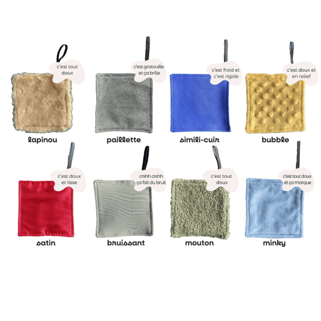 - Variété des textures : chaque carré sensoriel est unique (doux, rugueux, satiné, bruissant).