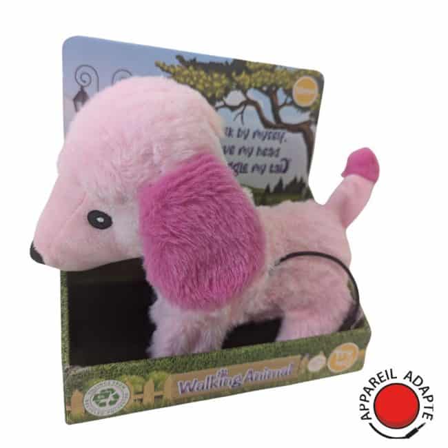 Chaque activation déclenche une séquence de plusieurs secondes (environ 5-10 secondes) pendant lesquelles la peluche marche et aboie avant de s’arrêter automatiquement.